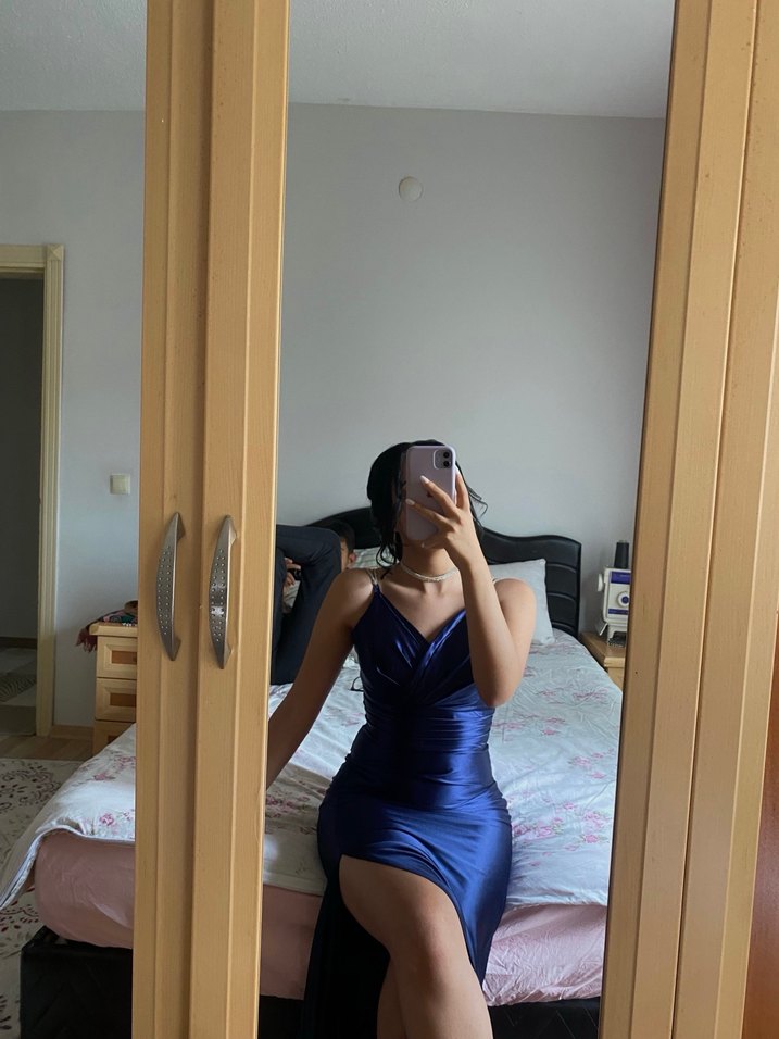 Mavi parlak kumaştan, v yaka ve drapeli detaylı, askılı, vücuda oturan uzun boy abiye elbise. 1 kez giyildi.