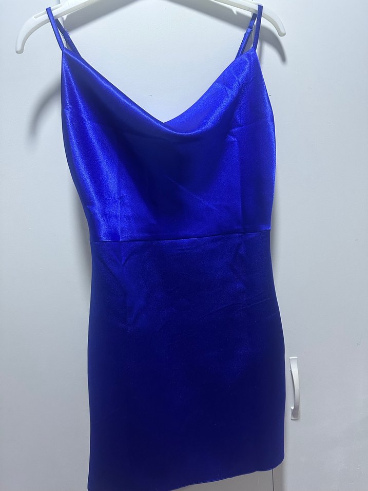 Mavi Parlak V Yakalı Drapeli Mini Elbise