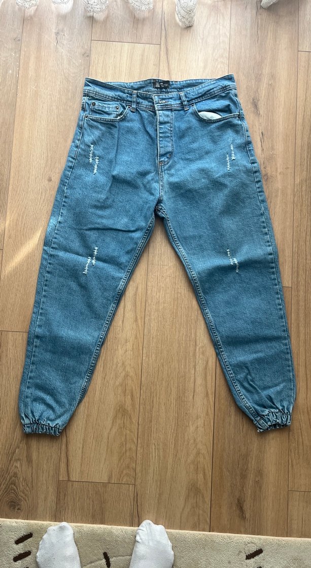Mavi parlak kot pantolon, rahat kesim ve hafif yırtık detaylara sahip. Normal boy ve lastikli paçalar, günlük sokak stili için uygun.