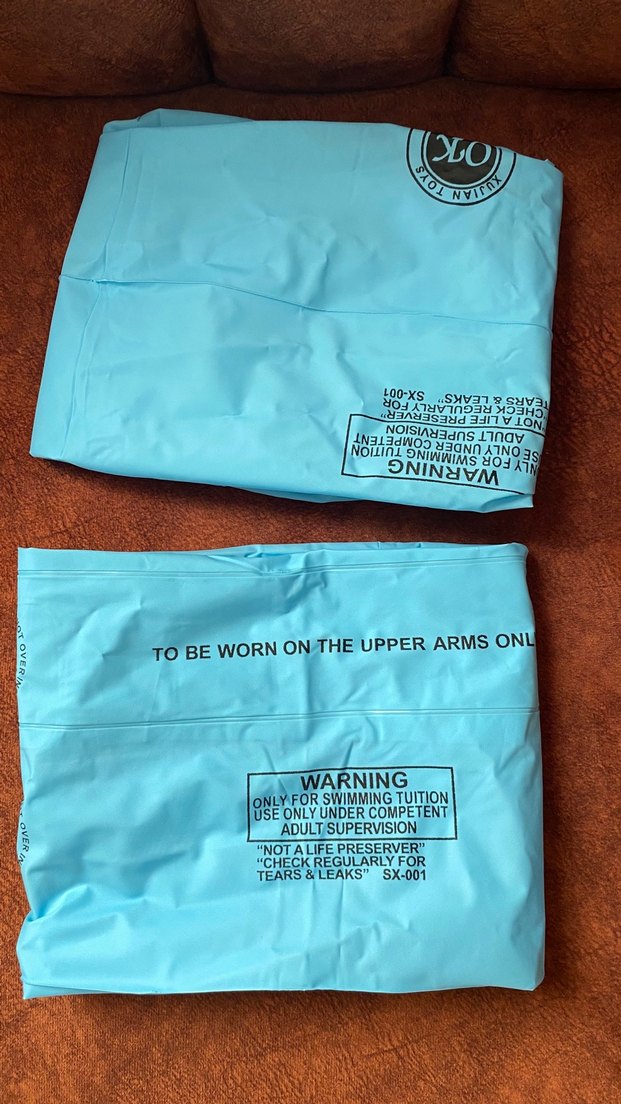 Parlak mavi renkte, üst kollarda kullanılmak üzere tasarlanmış yüzme kollukları, üzerinde güvenlik uyarıları bulunur. ⚠️