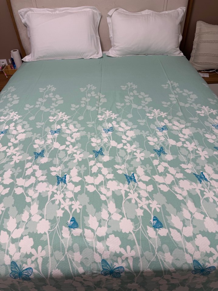 Pastel mavi zemin üzerine baskılı çiçek ve kelebek desenleriyle huzurlu ve ferah bir görünüm sunar. Özdilekten alındı Çok az kullanıldı Temiz ve defosuzdur