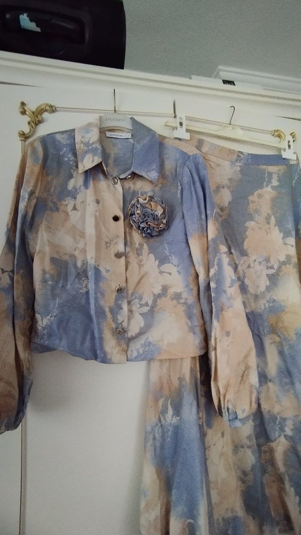 Mavi tonlarda pastel batik desenli, düğmeli, uzun kollu, uzun boylu, bol kesim kadın takımı. İpek gibi kumaştan, vintage bohem tarzda, ofis kullanımı için uygun.