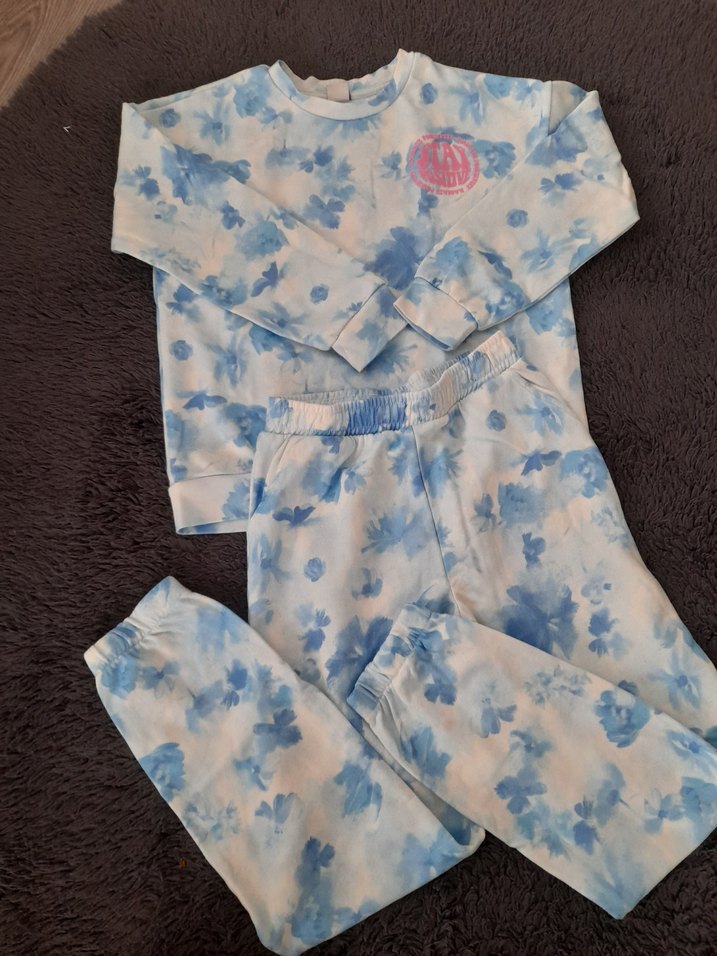 Yumuşak kumaştan, uzun kollu ve bisiklet yaka, mavi pastel batik desenli bol kesim kız eşofman takımı, düğmeli detaylarla.