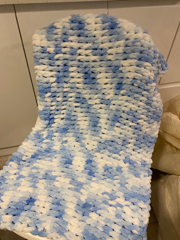 Pastel mavi batik desenli, yumuşak örgü çocuk battaniyesi, sıcak tutar.