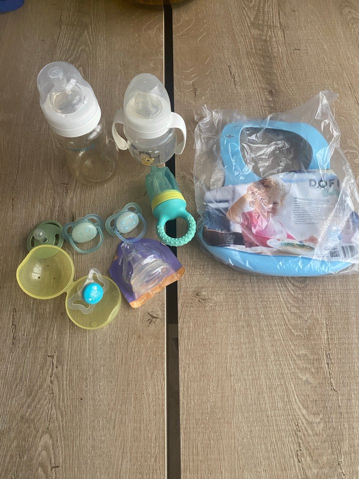 Bebek besleme ve rahatlatma için pastel mavi tonlarda biberon, emzik ve diş kaşıyıcı içeren set. Adet fiyatı 50 tldir. Emzik biberon hiç kullanılmamıştır. Biberon ucu 1 adettir.
