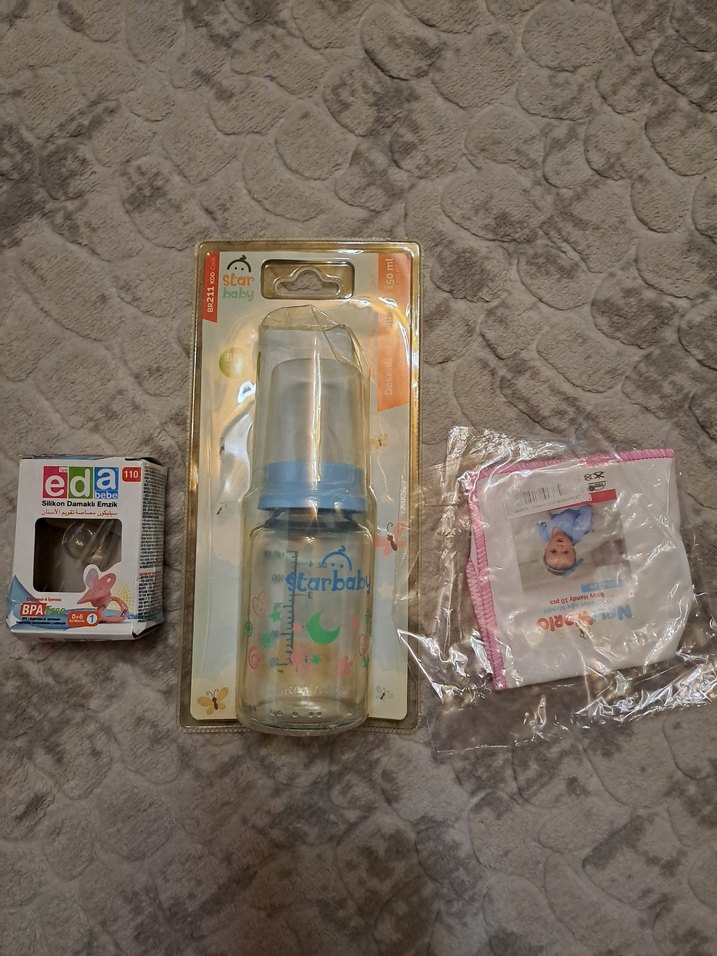 Ölçü işaretli pastel mavi bebek biberonu, yumuşak emzik ve Eda markalı silikon emzik ile bebek bakım bezi içerir. BPA içermez. 1 adet ağız mendili bir adet emzik bir adet cam biberon hepsi bir fiyat