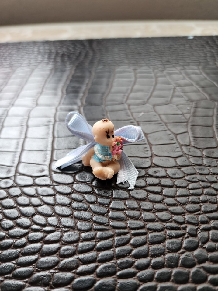 Pastel mavi renkte küçük bebek figürin, çiçek buketi ve zarif beyaz kurdele ile süslenmiştir. Göründüğü kadardır, değerlendirmelik..