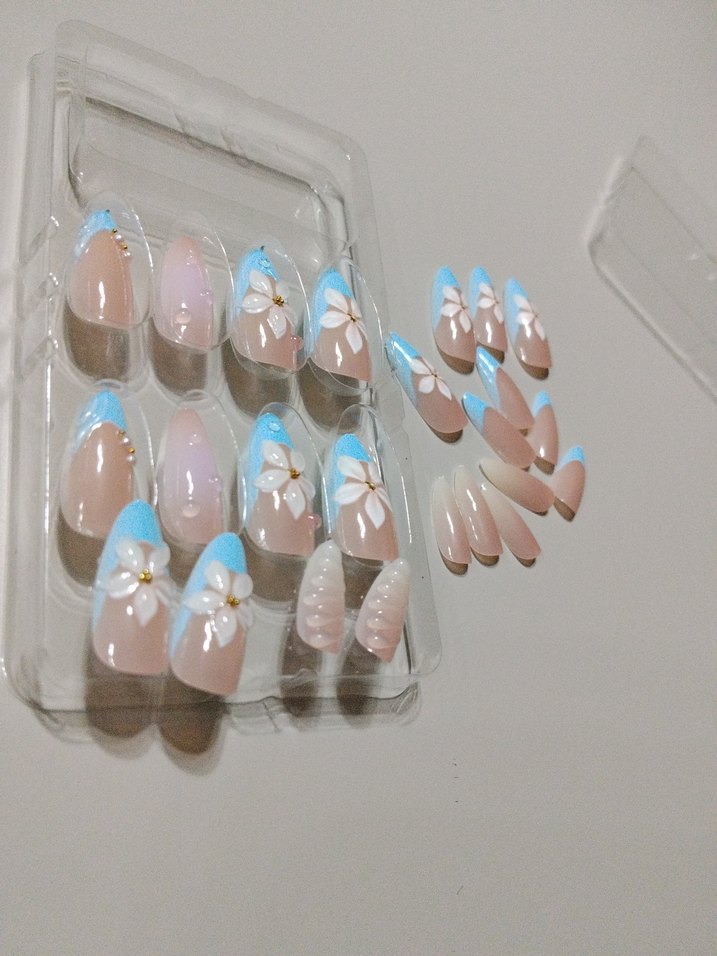 Pastel mavi tonlarında, beyaz çiçek desenli ve küçük süslemelerle detaylandırılmış tırnak süsleri.