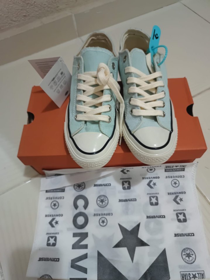 Mavi pastel renkli Converse kadın spor ayakkabısı, düz kauçuk tabanlıdır. Desensiz tasarımıyla günlük kullanım için rahat ve şık bir tercihtir. ithal QR kodu mevcut verilebilir
