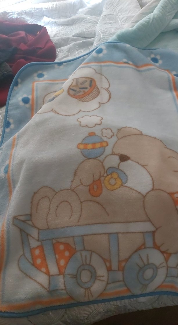 Yumuşak ve sıcak kumaştan yapılmış, pastel mavi renkte ve baskılı ayıcık desenli çocuk battaniyesi. Rahatlık için ideal.