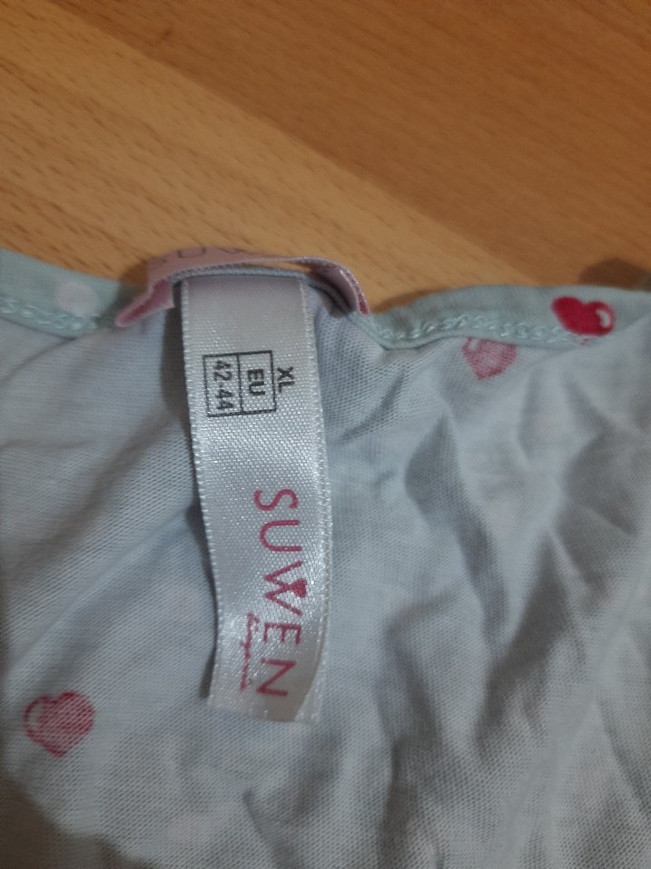 Mavi renkte, küçük kalp desenlerinin bulunduğu pastel tonlarda çocuk atletidir. Etiketinde SUWEN markası yer alır.