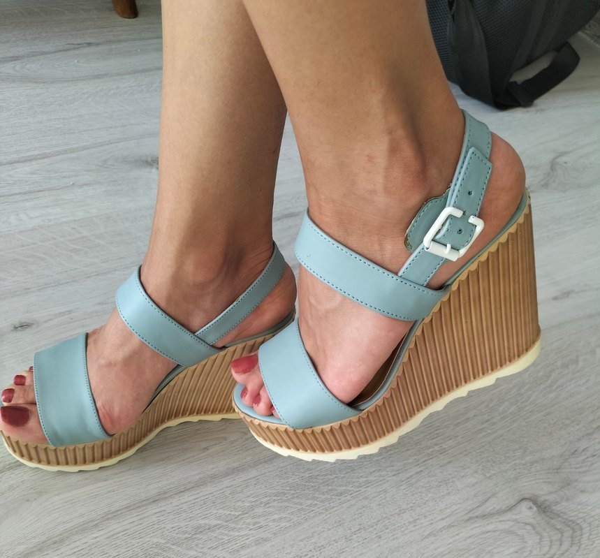 Pastel mavi renkte, baskılı desenli, dolgu topuklu kadın sandalet. Tokalı kayış tasarımı ve kauçuk malzeme ile günlük rahat kullanım için uygundur. 37 numara fakat 36 numaran giyen biri kullanabilir. zamana bağlı deformeleri mevcuttur. fotoğraflardaki gibidir.