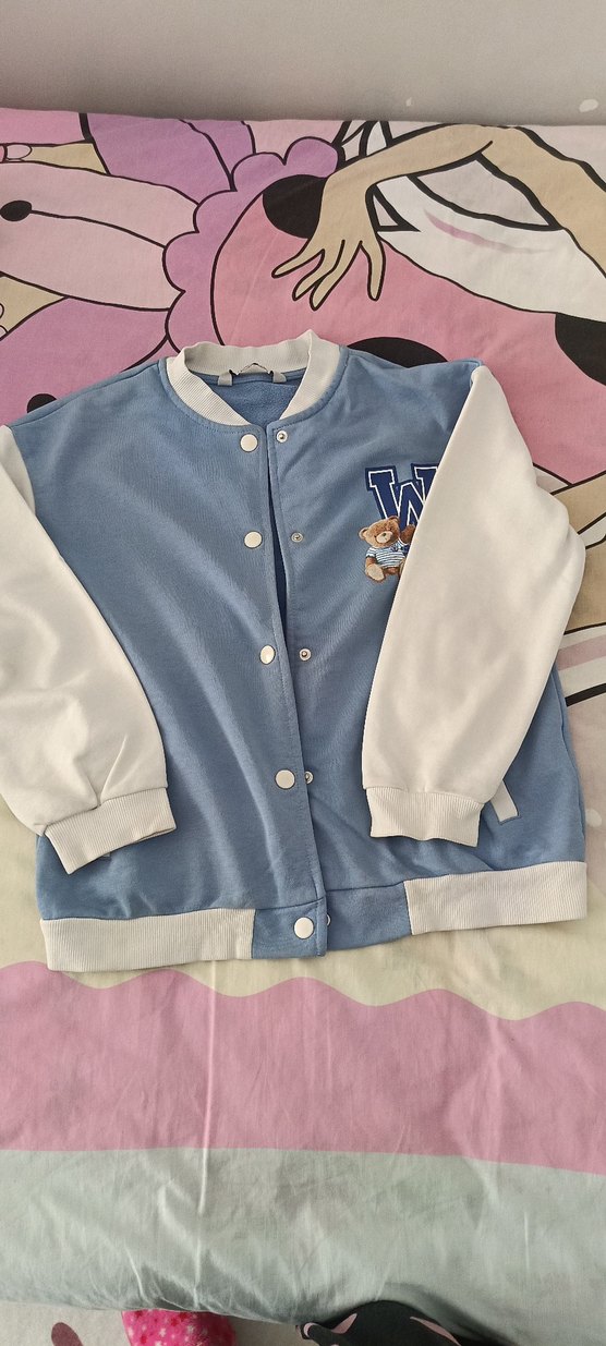 Kadın ceket, bol kesim, uzun beyaz kollu ve pastel mavi gövdeli. Yuvarlak yaka, düğmeli ve yumuşak, sıcak kumaştan. Göğüste ayıcık ve harf detaylı, gündelik sokak stili için uygun.