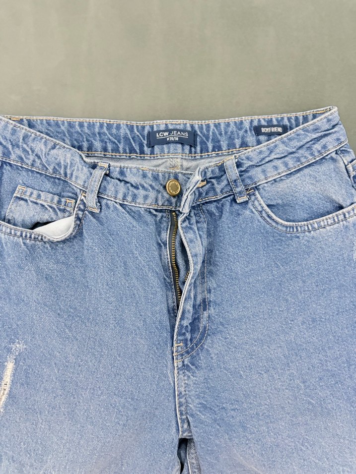 Düğmeli, bol kesim ve pastel mavi renkte denim kumaştan yapılmış kadın jean günlük kullanıma uygun sade, rahat tarzda.