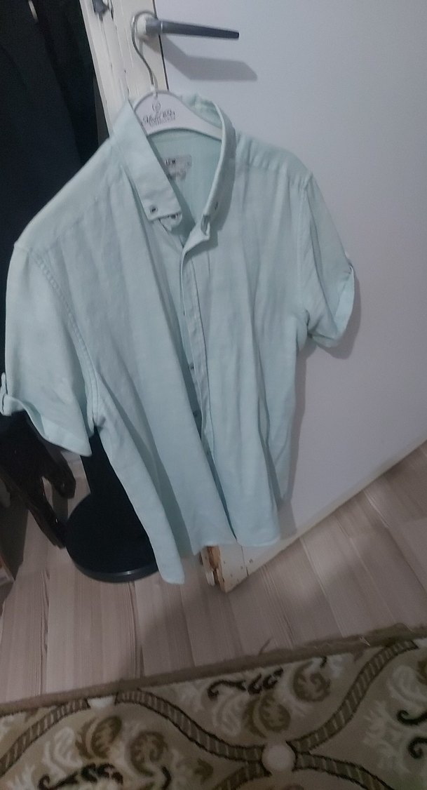 Mavi pastel renkte, keten kumaştan yapılmış, kısa kollu, düğmeli, yakalı ve bol kesim erkek gömleği. Günlük kullanım için uygundur. iki göğüs 50 santim uzunluğu 65 66