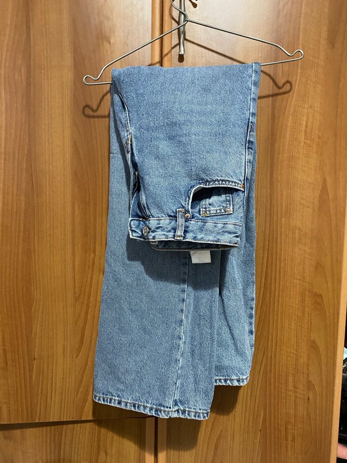 Bol kesim, mavi kot pantolon, günlük kullanım için uygun rahat sokak stili.