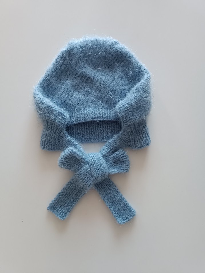 Pastel mavi renkte, örgü dokulu, sade bere. Yumuşak ve bağlamalı tasarımıyla sıcak tutar. #kadın#bere#şapka#balaclava