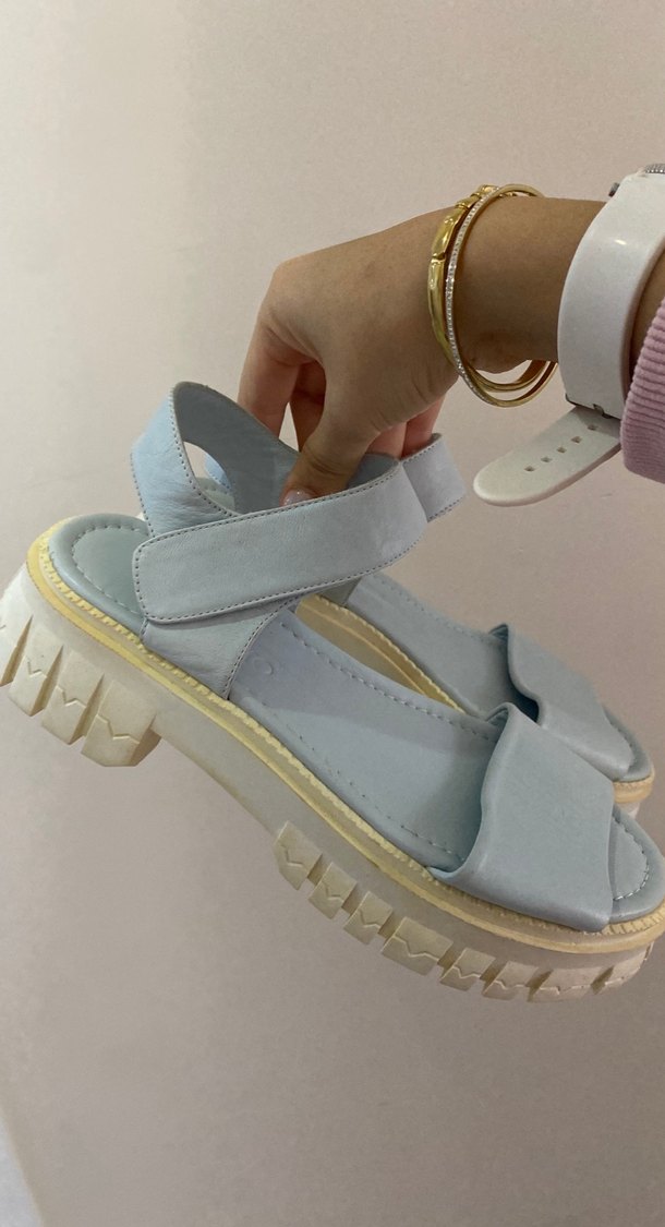 Mavi pastel renkli, tokalı kayışa ve kalın kauçuk tabana sahip platform topuklu sandaletler. Minimalist, desensiz tasarımıyla günlük şıklık için uygun.