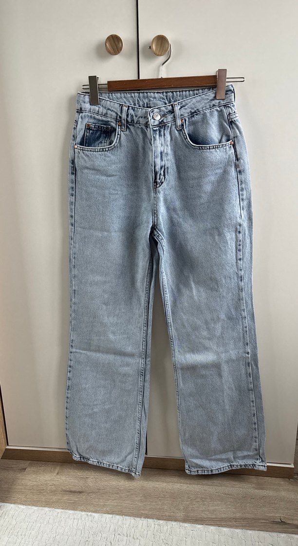 Mavi pastel renkli, rahat kesim ve normal midi boyda kot pantolon. Günlük kullanım için trend ve zahmetsiz şıklık sunar.