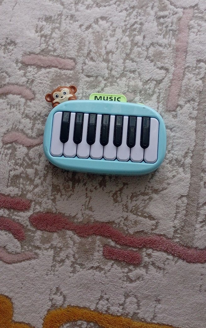 Pastel mavi renkte, siyah beyaz tuşlara sahip küçük maymun figürlü eğitici müzik oyuncağı.