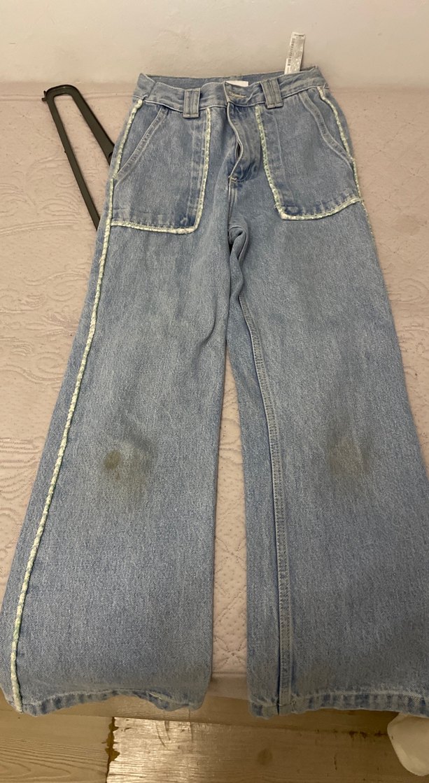 Mavi pastel renkte, bol kesim ve normal midi boyda, kemerli detaylı kadın denim pantolon, günlük kullanıma uygun. Çay döküldü daha sonra yıkadım çıkmadı leke çıkartıcıyla falan belki çıkar.daha bir kere giymiştim kalıbı falan çok güzel