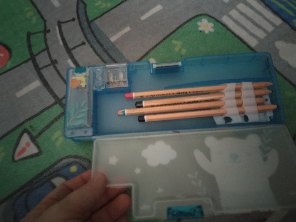 Mavi pastel kalem Kutunun şeffaf kapağında bulut ve yıldız desenleri vardır. ✏️