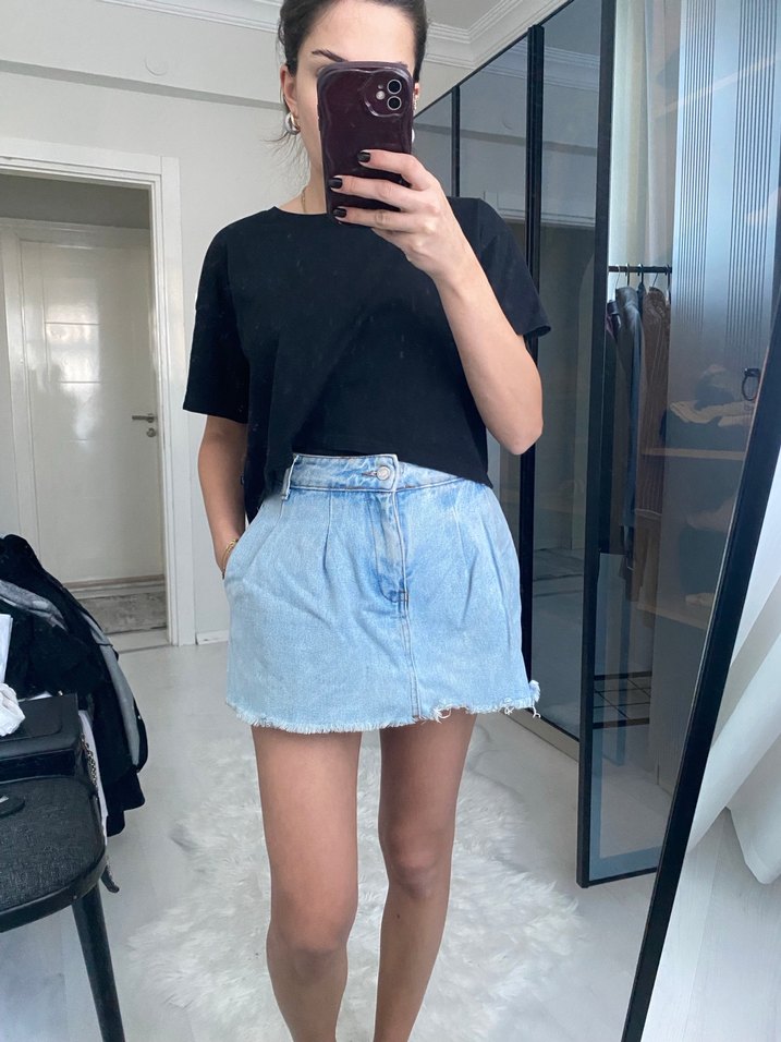 Mavi pastel renkli mini kot etek, bol kesim ve kısa boyda, salaş sokak stili için ham kenarlı tasarım sunar. Günlük kullanıma uygun, zahmetsiz şıklık sağlar.