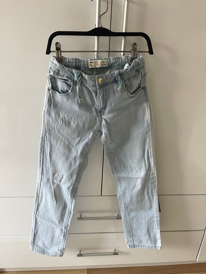 Pastel mavi renkte, bağcıklı detaylı, midi boy, rahat kesim kadın kot pantolon. Günlük kullanıma uygun sokak stili.