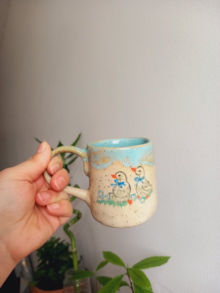 Pastel mavi üst kısmı ve el boyaması iki ördek desenine sahip seramik kupa. Ürün stoneware çamurundan üretilmiştir gıdaya uygundur 175 ml almadan önce mevcut olup olmadığını sorun