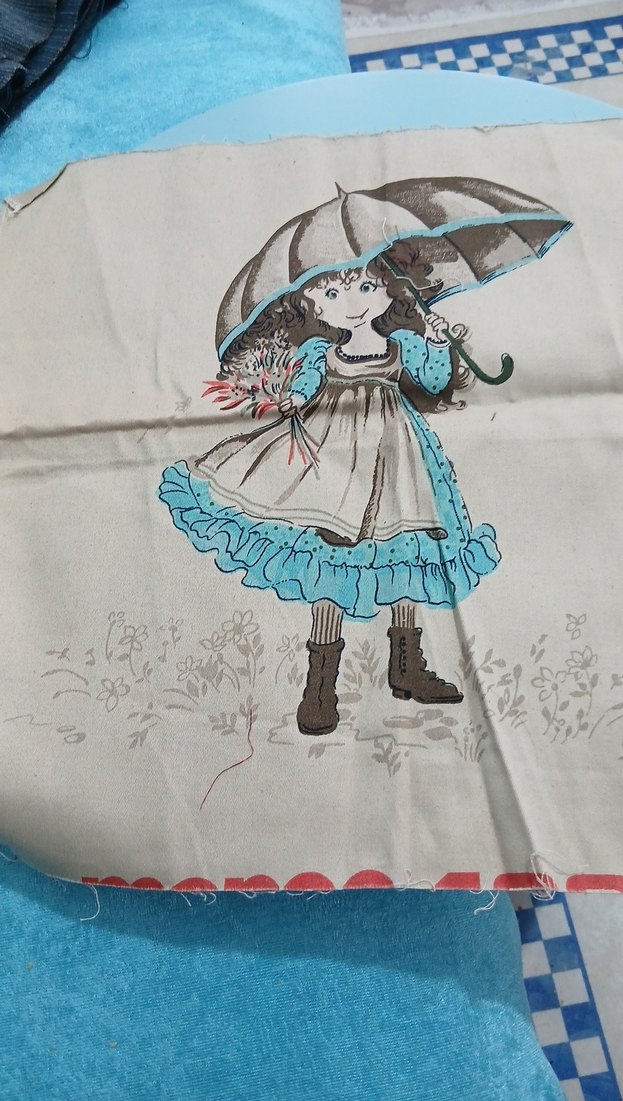 Kumaş üzerinde pastel mavi tonlarda şemsiye tutan ve çiçek buketi taşıyan bebek deseni bulunur. Bebek, fırfırlı elbise ve botlar giymiştir. ☂️
