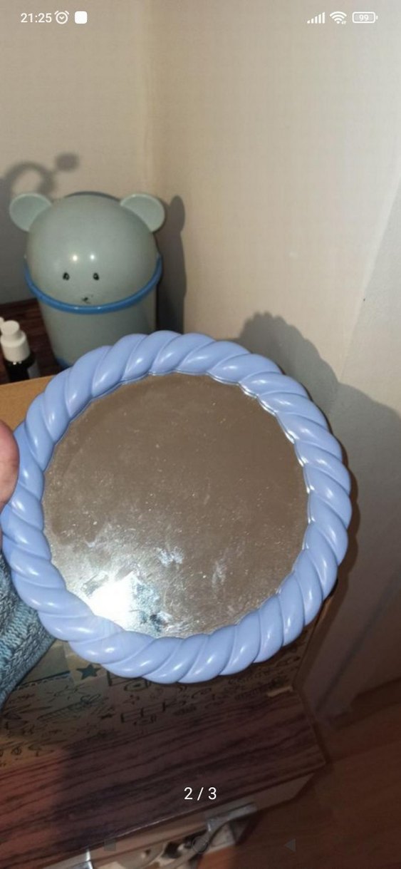 Pastel mavi burgu çerçeveli yuvarlak ayna, mekana yumuşak ve hoş bir hava katıyor.