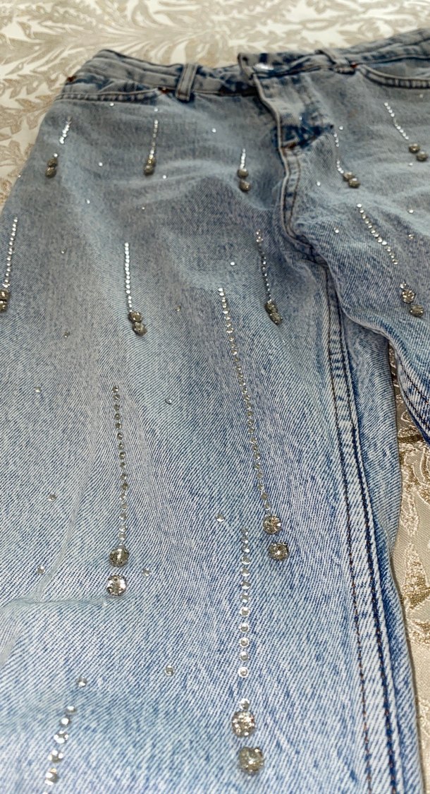 Salaş kesim, midi boy mavi kot pantolon, payetli ve işlemeli detaylarla parlak bir görünüm sunar, günlük sokak stili için uygundur.