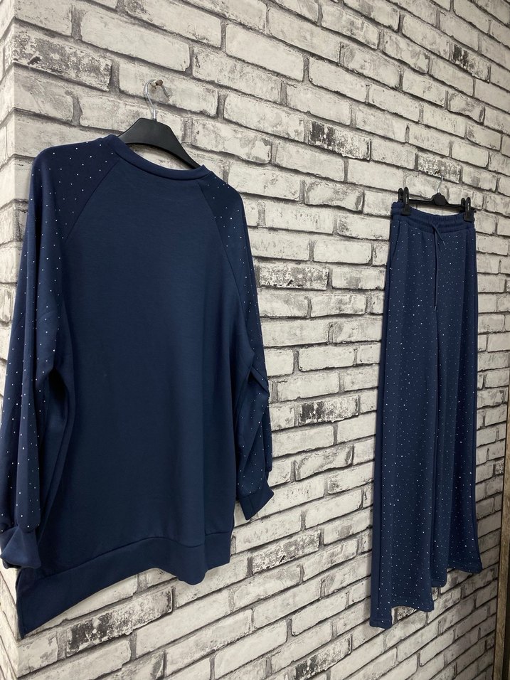 Payetli detaylara sahip, uzun kollu, yuvarlak yakalı, bol kesim mavi kadın eşofman takımı. Rahat ve şık sokak stili için uygun. ✨