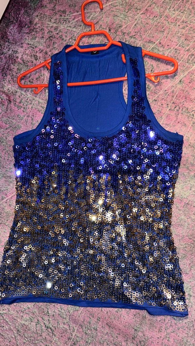 Mavi ve altın renklerde payetlerle kaplı, sıfır kol ve yuvarlak yaka kadın atlet. Sentetik kumaştan, renkli ve gösterişli, parti ve sokak modasına uygun.✨