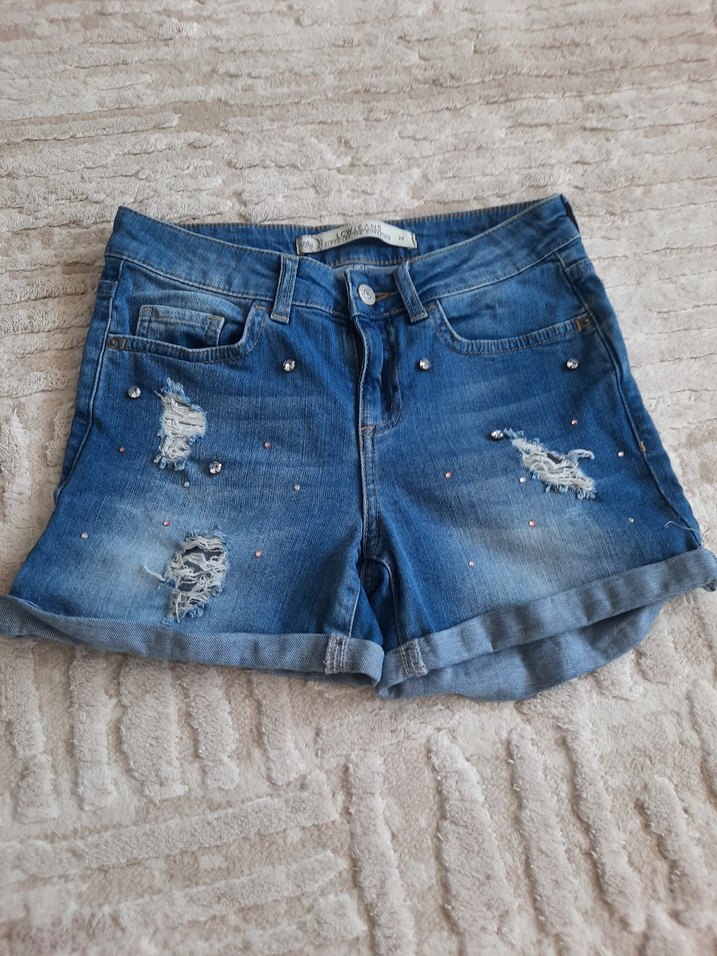 Mavi denimden, payetli ve yırtık detaylı, loose fit mini şort. Parlak ve nakışlı desenlerle günlük sokak stiline uygun.