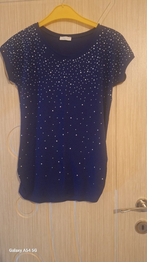 Kısa kollu, yuvarlak yaka ve payetlerle süslenmiş, dar kesim mavi bluz. Yumuşak sentetik kumaştan, günlük tarz için uygun. ✨
