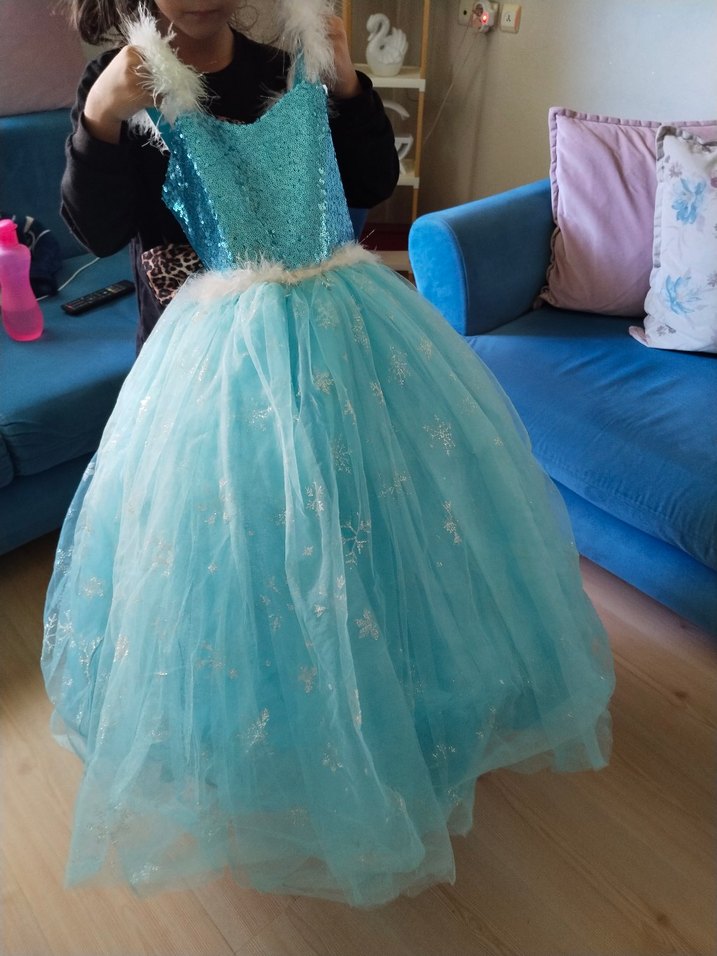 Mavi renkte, straplez ve payetli detaylara sahip, nakış işlemeli kız çocuk abiye elbise. Sentetik yumuşak kumaştan, kolsuz ve bohem tarzda, modaya uygun bir seçenek. ✨Elsa kostüm 1kez doğum gününde giyildi sorunsuz tertemiz