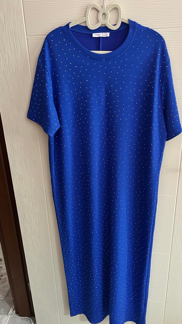 Mavi uzun elbise, kısa kollu ve yuvarlak yakalıdır. Bol kesimi ve küçük payet detaylarıyla parlak bir görünüme sahiptir.