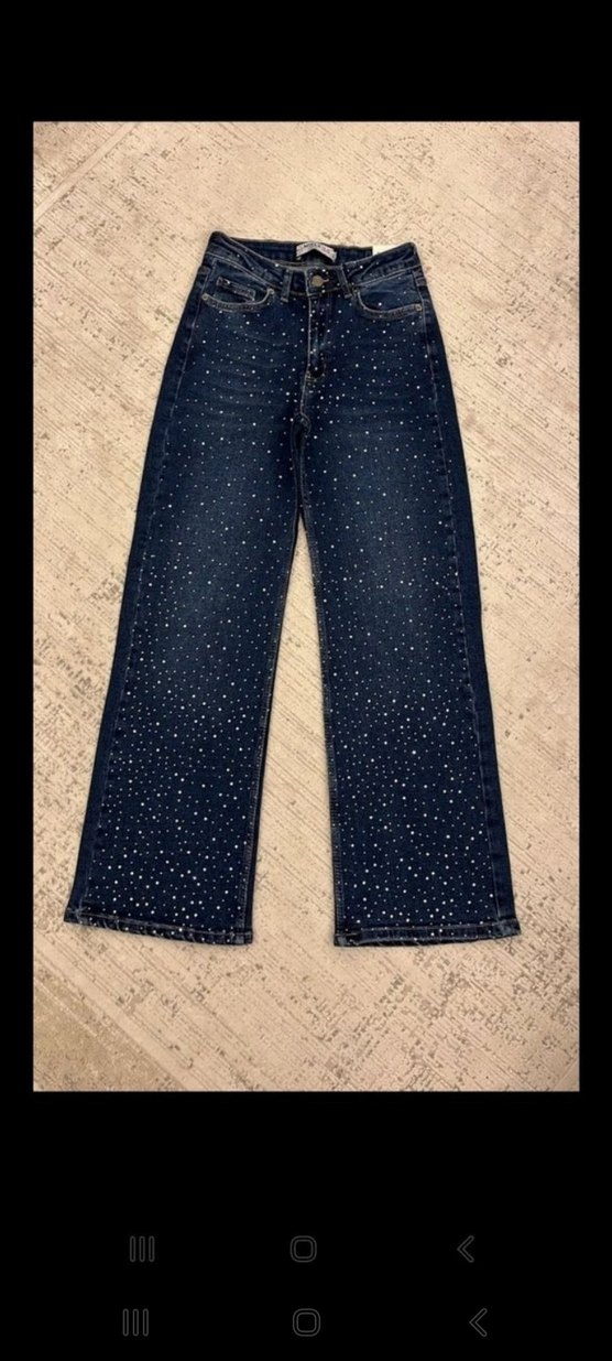 Mavi denimden, payetli ve işlemeli detaylara sahip, rahat kesim uzun kot pantolon. Günlük sokak stili için uygundur. ✨