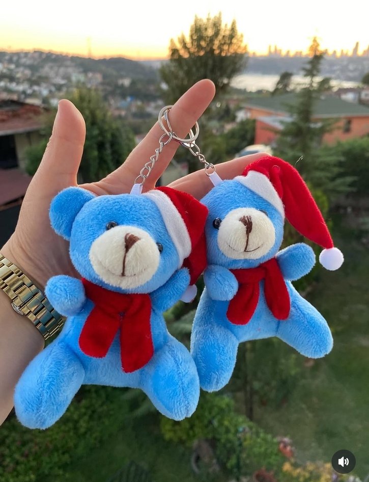 Kırmızı atkı ve Noel şapkası takan iki mavi peluş ayıcık anahtarlık. Yumuşak ve renkli, metal halka İLE. ADET FİYATIDIR ADET FİYATIDIR