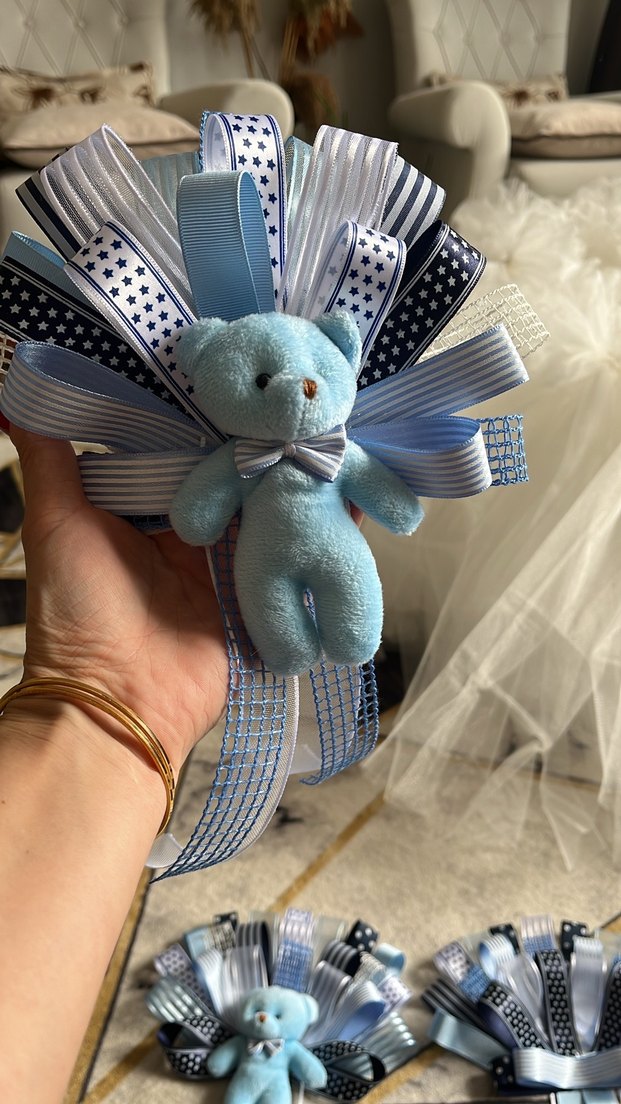 Pastel mavi renkte küçük peluş ayıcık, farklı desenlerde mavi ve beyaz kurdelelerle süslenmiş. Ayıcığın boynunda fiyonk bulunur. Kapı süsü yastık süsü olarak kullanılır pembe rengi de yapılmaktadır