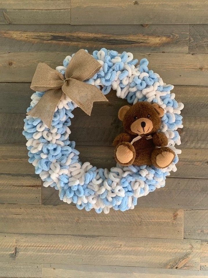 Pastel mavi peluş çiçeklerle süslenmiş, kahverengi yumuşak peluş ayıcık ve keten fiyonk bulunan kapı süsü.