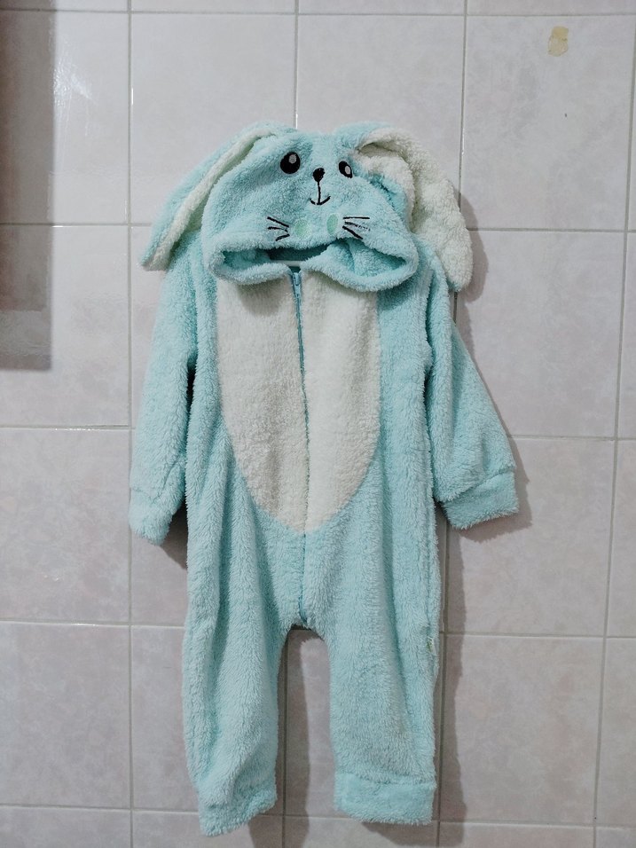 Peluş kumaştan yapılmış mavi bebek tulumu, sevimli tavşan kapüşon ve rahat kesim ile detaylandırılmış.