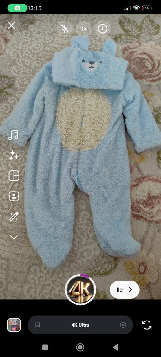 Pastel mavi renkte, göğüs ve kapüşonda kürk detaylı, yumuşak ve sıcak kumaştan yapılmış bebek tulumu. ❄️