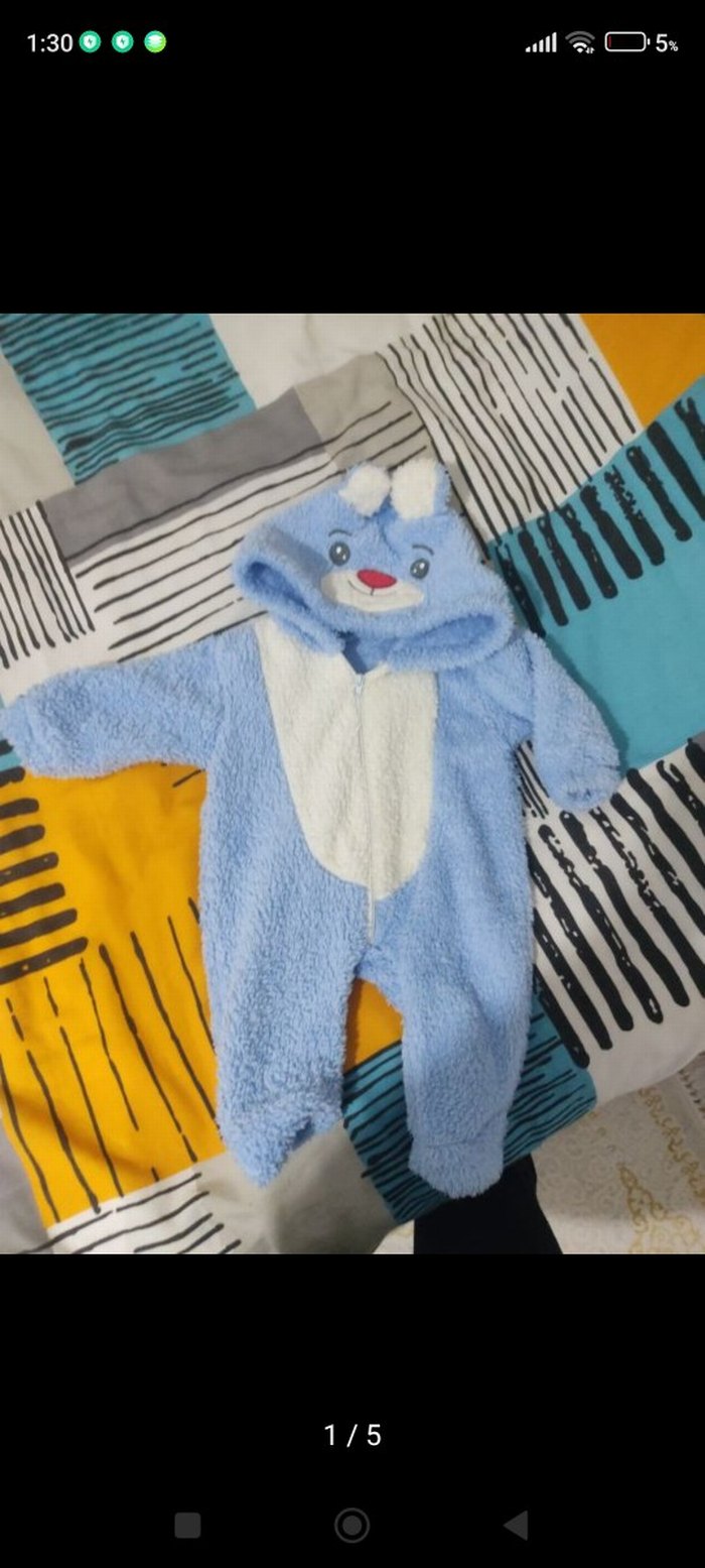 Peluş kumaştan, kapüşonlu ve kürk detaylı mavi renkli baskılı bebek tulumu. 3 4 ayina kadar cok rahat olur.