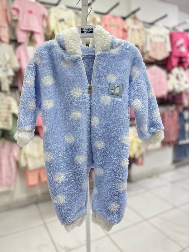 Mavi peluş bebek tulumu, kürk detaylı ve pastel tonlarda batik desenlidir. Fermuarlı ve rahat iç astarlıdır. 9,12?18,24 aylık