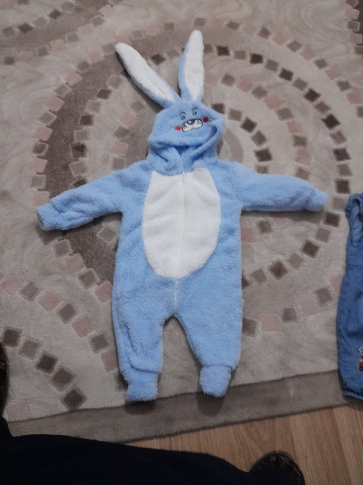 Pastel mavi renkli, yumuşak dokulu peluş bebek tulumu. Kapüşonunda tavşan kulakları ve yüz detayı bulunur. Düz ve normcore tarzda, sıcak tutar.