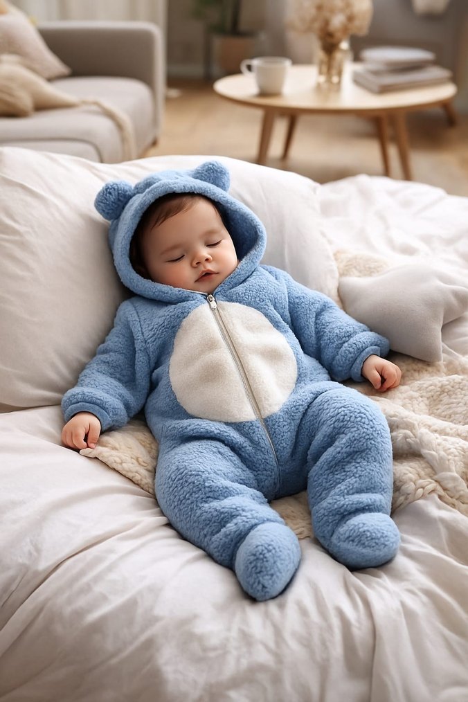 Yumuşak mavi peluş kumaştan yapılmış, ayıcık kulaklı kapüşon ve ön fermuarlı bebek tulumu. Sade normcore tarzda, kürk detaylı.