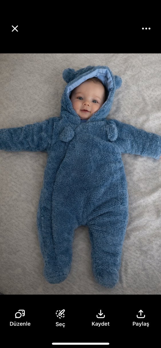 Yumuşak ve sıcak mavi peluş bebek tulumu, kapüşon ve kürk detaylarıyla sade tarzda tasarlanmıştır.