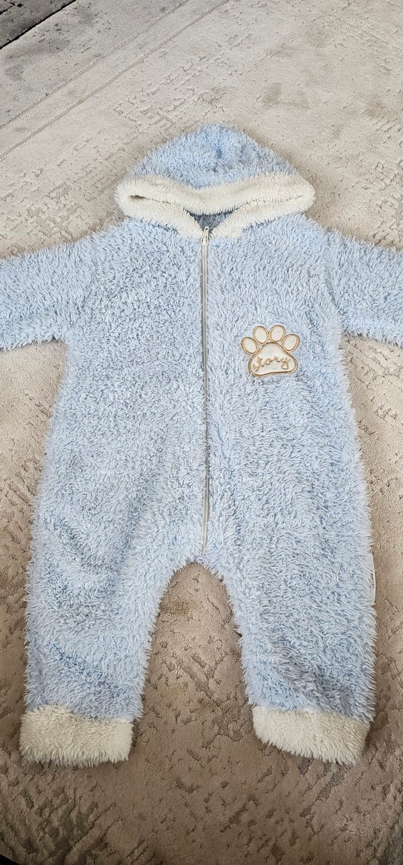 Kapüşonlu, yumuşak ve sıcak mavi bebek tulumu, kürk detaylı ve nakışlı desenlidir. Sokak stili için uygundur. ❄️